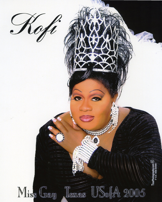 *Kofi is also a former Miss Gay Houston America (prelim to Miss Gay Texas America), Miss Gay Houston USofA (prelim to Miss Gay Texas USofA), Miss Gay Delta State America, Miss Gay Gulf Coast America, and Miss Southwest Continental Plus.